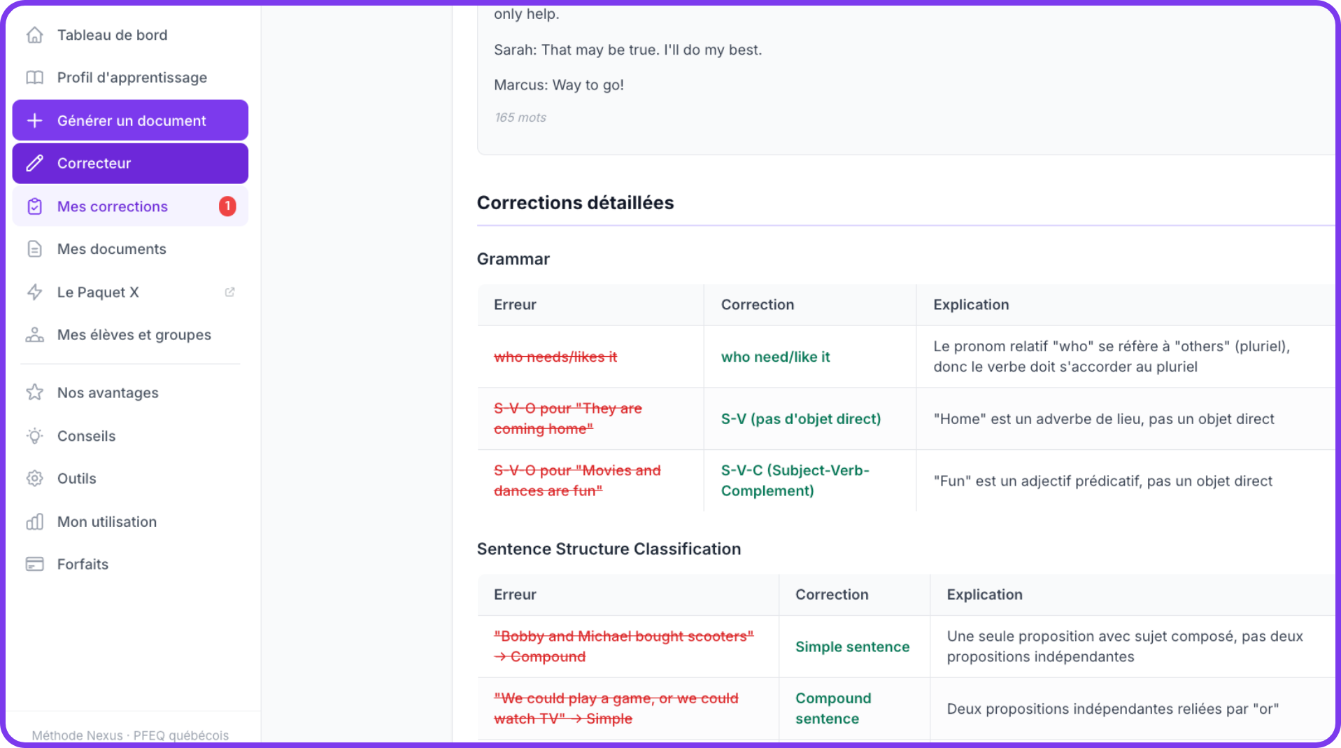 Soumettez un texte ou une photo du travail de l’élève. La plateforme corrige en profondeur, identifie les erreurs, et fournit des commentaires pédagogiques détaillés.