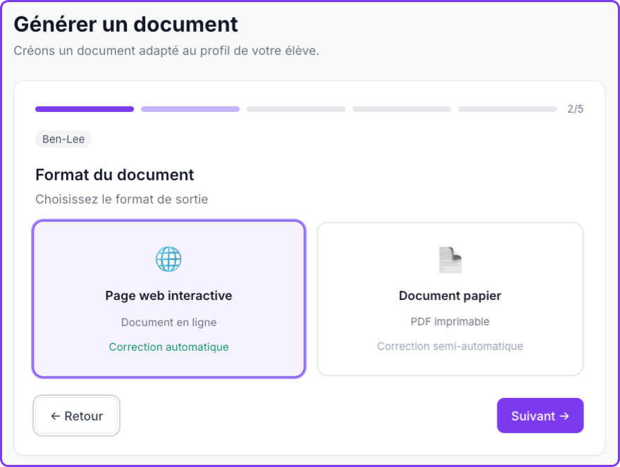 Exercices, examens, quiz, résumés, théorie, diagnostics… choisissez le type, la matière, le niveau, et la plateforme fait le reste. Chaque document est unique et adapté au profil de l’élève.