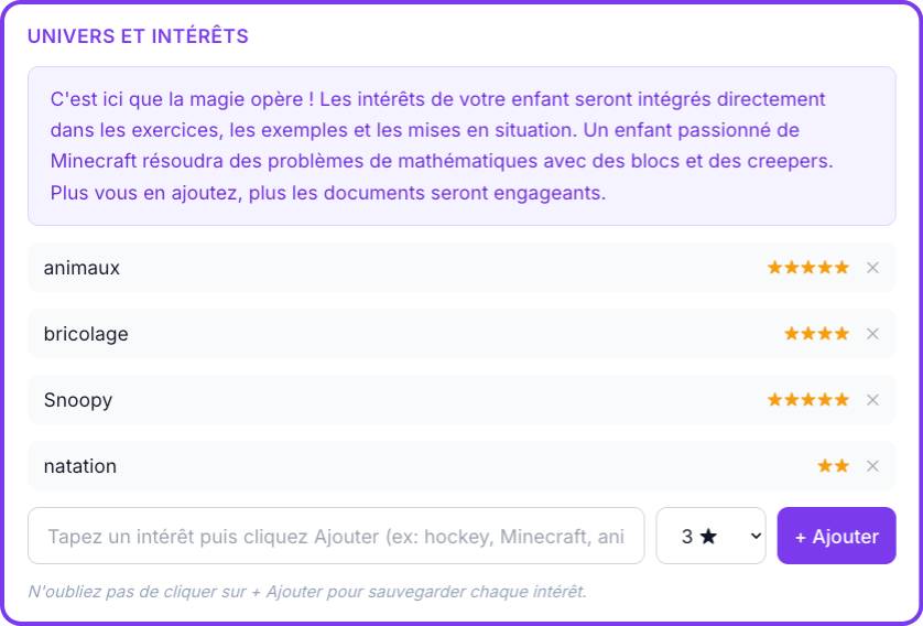 Chaque document est adapté aux intérêts, au niveau et aux besoins spécifiques de l'élève.