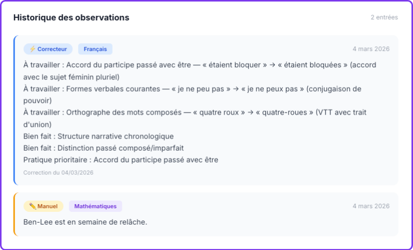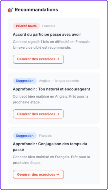 Chaque correction alimente le profil de l’élève : forces, défis, recommandations. Visualisez la progression et recevez des suggestions personnalisées.